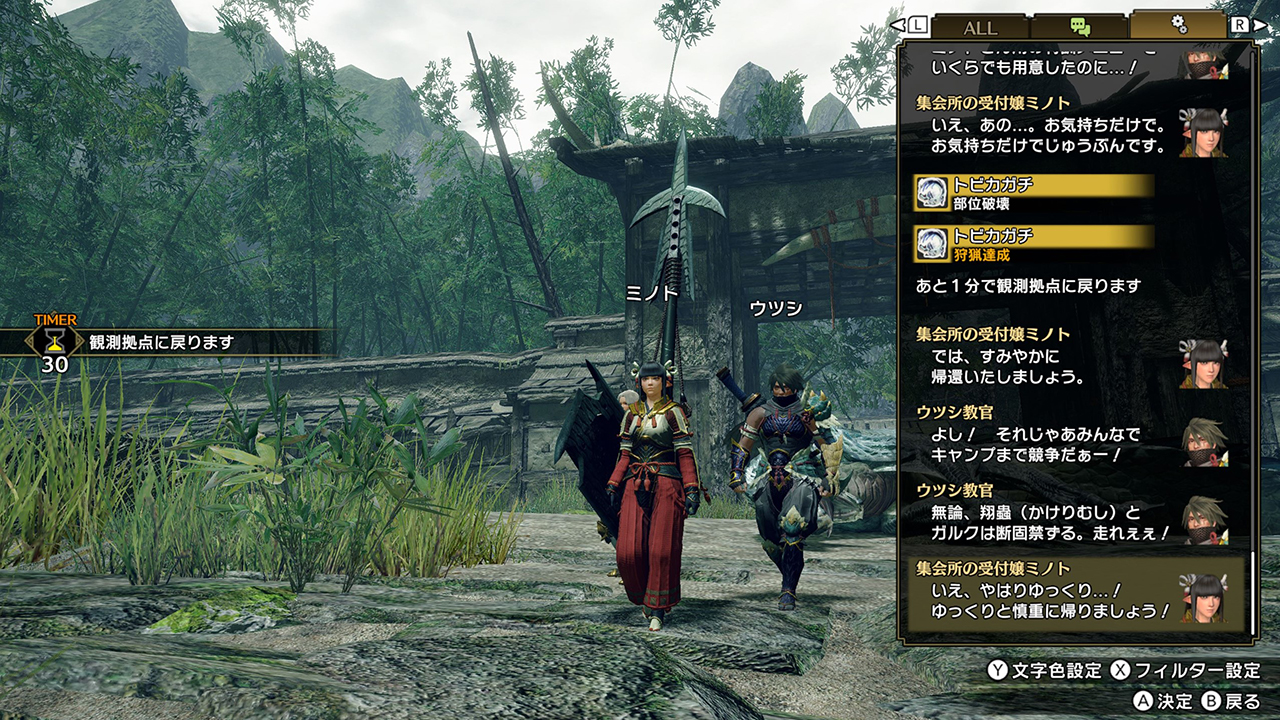 And then there’s the fact that the protagonist talks. I remember people being very surprised when the hunter spoke in the first trailer. There are 20 default voices, and more than 20 extra ones. I remember how hard it was to come up with enough variations of lines for all of them. On the other hand, I also got the opportunity to show sides of the NPCs at Kamura and Elgado that you normally can’t really express in story cutscenes, so I had a lot of fun writing those lines. Especially Master Utsushi, Bahari, and Jae. They were a lot of fun to write for, so I really let myself go, within the confines of the characters, of course. For Master Utsushi, I even wrote a couple of stupidly long lines just for the heck of it, but they actually ended up getting used! And lastly, the songs. Songs are a major element in Rise. The in-game songs that use Monster Hunter language were originally written in Japanese, and they were made to fit the situation and setting they were used in. They give you a deeper glimpse into the world of this game, so if you know Japanese, it might be worth listening to the soundtrack and seeing if you can figure the lyrics out. Thinking back, this is the first time I’ve written songs for a game since Mega Man Star Force 3, a Nintendo DS game featuring a scene where an idol sings a song at a concert. Back then, we couldn’t use actual vocals because of memory constraints, so I had to have the text move along in accordance with the music, but this time, I was able to have the lyrics I wrote sung by renowned artists, which was a deeply moving experience.