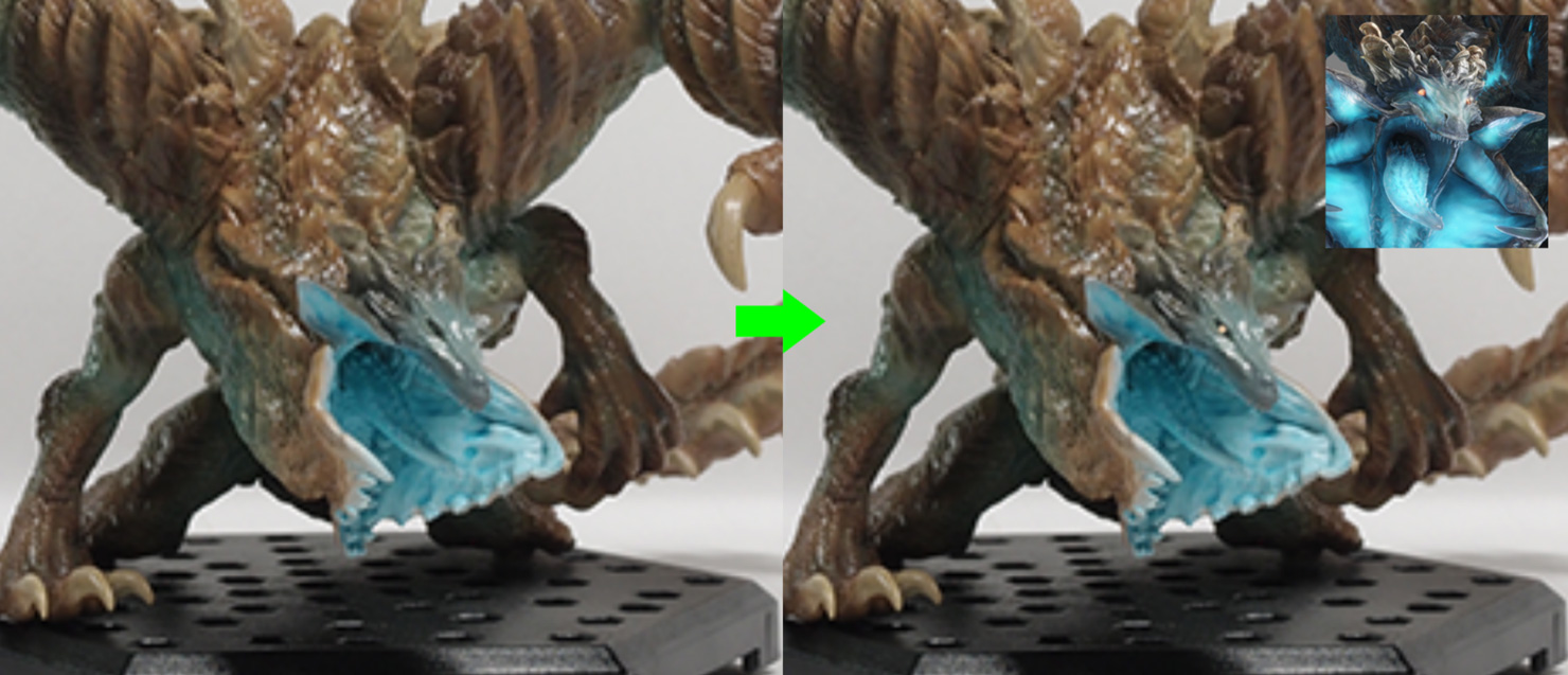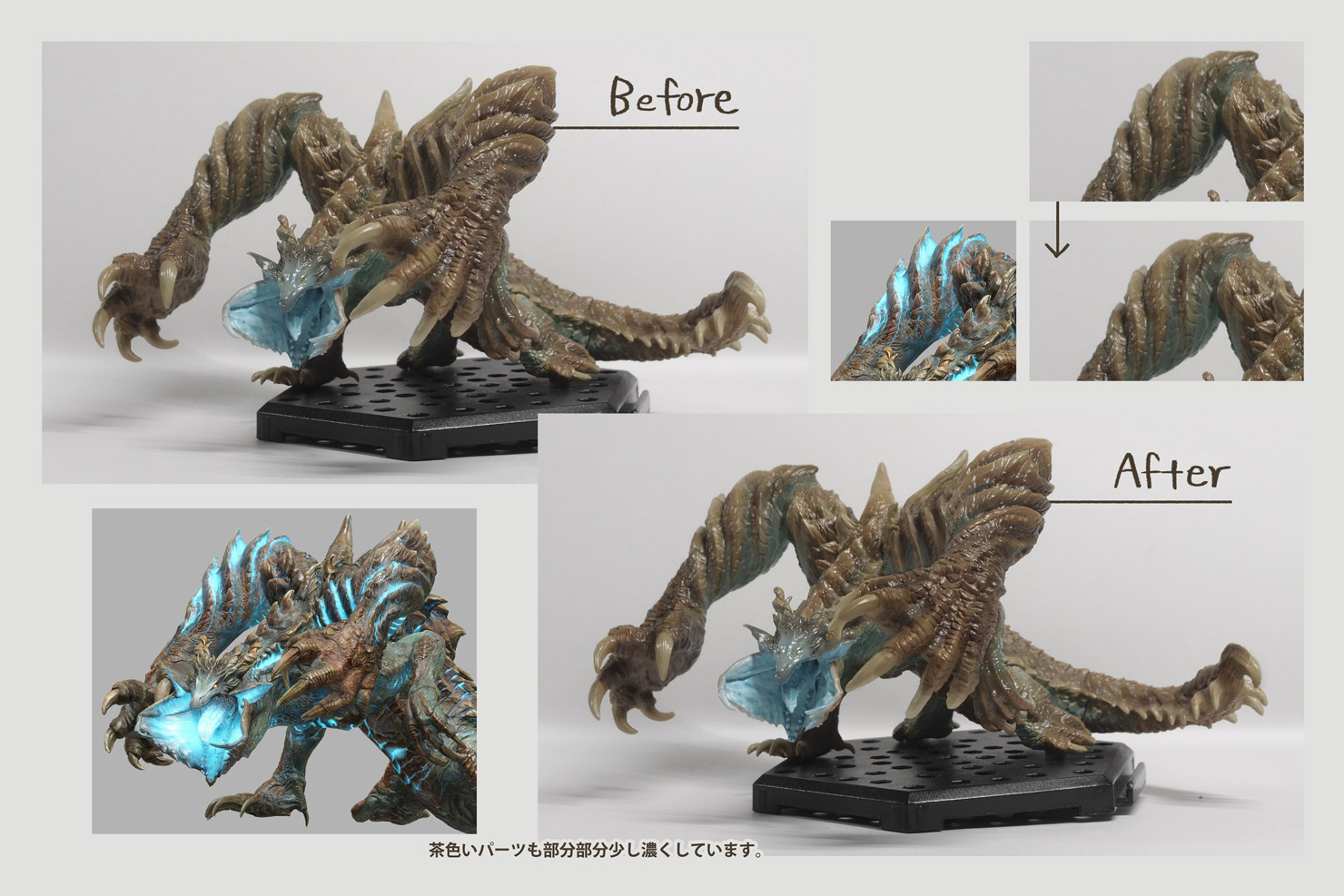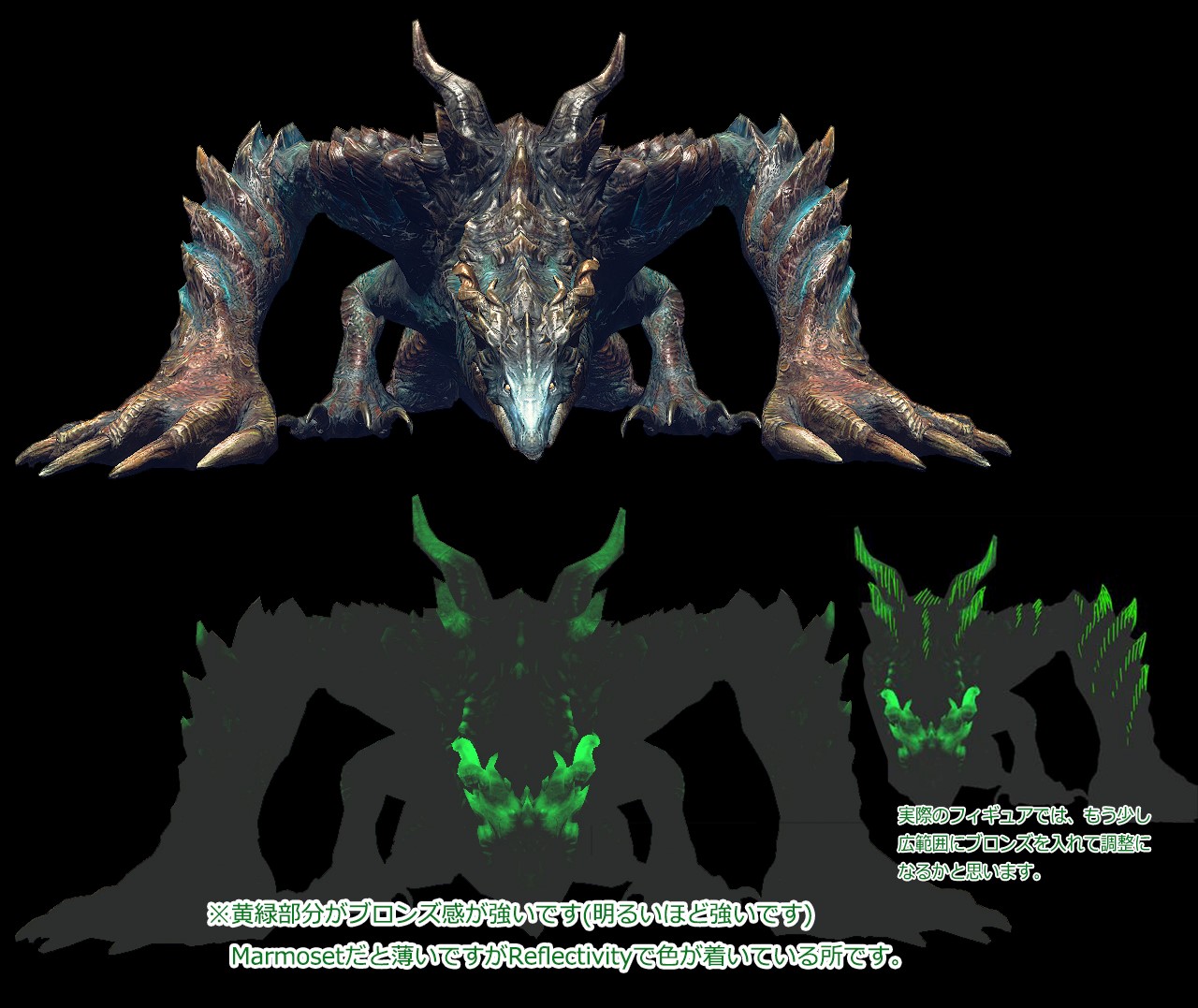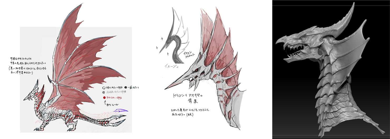 A2: I was very particular about the coloring to make the monsters look as lifelike as possible. The texturing technology has really advanced a lot in recent years, so conveying the complex coloring through words and written text to the painters was quite complicated. Also, in regards to the shape, I paid particular attention to the images of the monsters used in promotional materials. However, these images are 2D so the poses are made to look cool in 2D, but when you’re looking at a figure, you can obviously look at it from any angle, and so we had to fill in the parts you cannot see in 2D, which could lead to discrepancies with the in-game monster. Finding an adequate middle ground between 2D and 3D was very complicated as well.