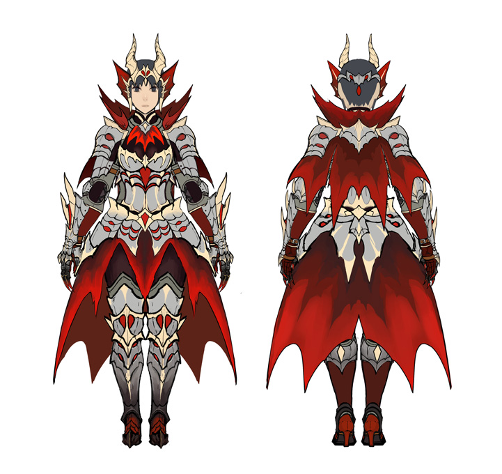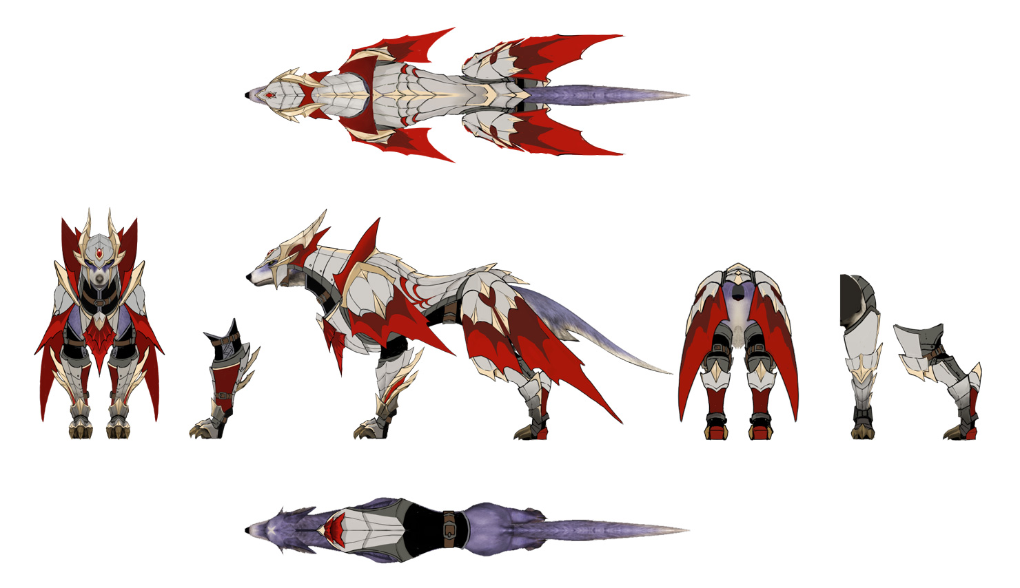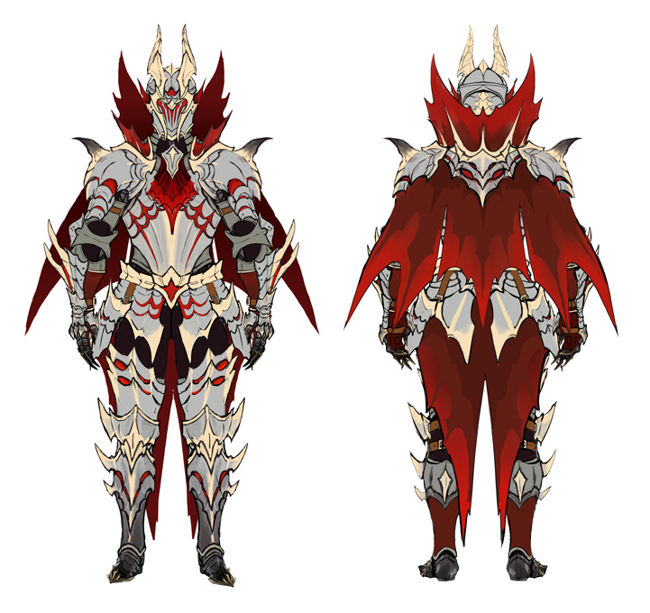 Rise: At first, I designed the Canynes and the Wirebugs. I also made the concepts for Bishaten, Rakna-Kadaki, and Crimson Glow Valstrax. I designed Palamute armor, came up with Canyne variations for the character editor, created and supervised the modeling of the Canynes, designed weapons and props, and loads of other things! ▼These are some of the equipment designs I have the strongest memories of. Of course the default equipment is the one that was used for a lot of materials, so that’s the one I have the strongest memories of. I had a very hard time creating the Alloy armor… I like how the Barrioth and Great Baggi design match that of the player’s armor.