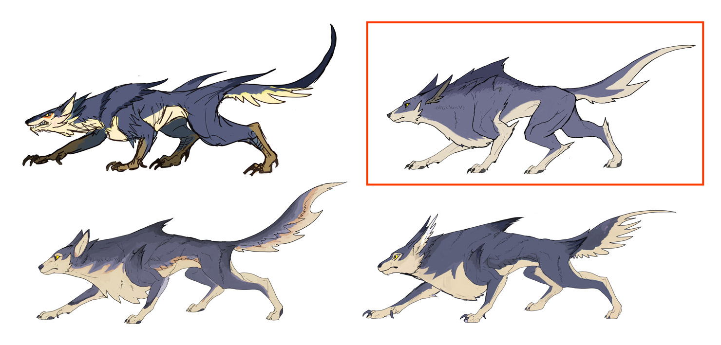 A2: The most important thing was to create a clear contrast with the Palicoes. Canynes had to look cool, and dog-like, but not resemble a wolf or a monster. An important theme was to make them look like “trusty partners.” Initially, I was told that they would be Buddies that provide attack support in combat, so I gave them sharp eyes and even scales, so they had quite a few monster-like elements. However, after talking to the designers and the Director, Mr. Ichinose, we gradually started adding more dog-like elements. ▼The idea of Palamutes being your partner/buddy also resulted in some images reminiscent of a falconer and his raptors. Parts of the silhouette that came from those ideas are still present in the current design.
