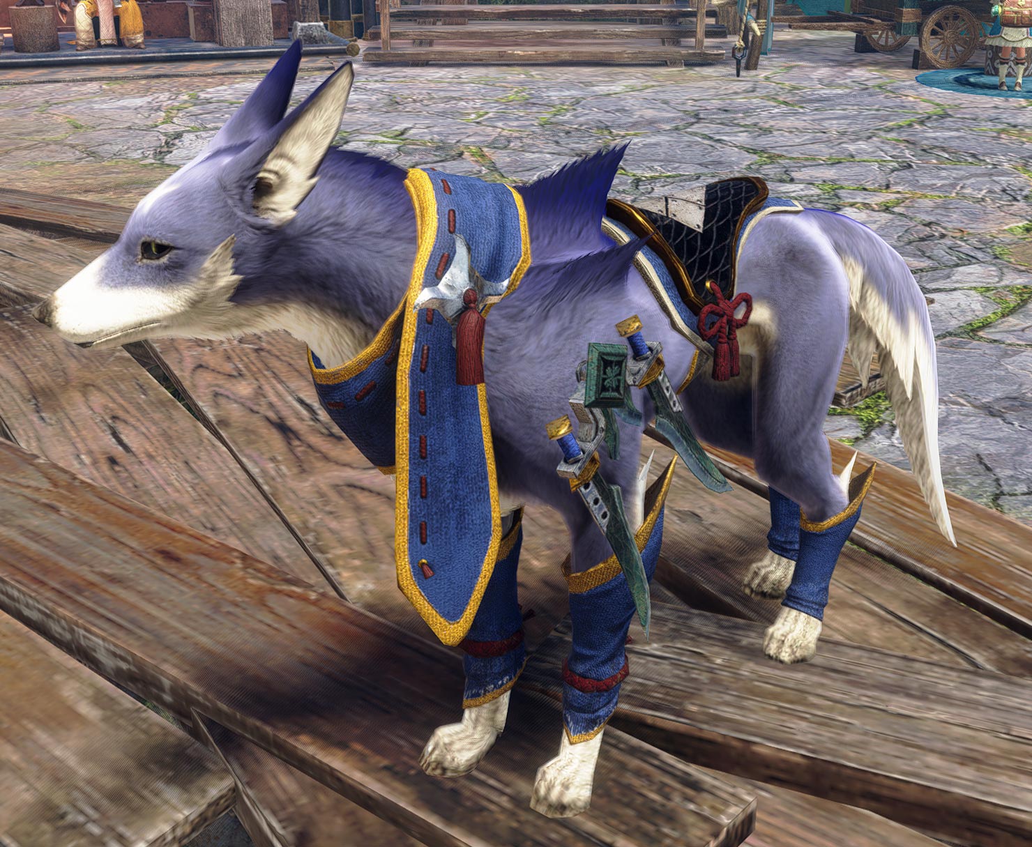 One of the keywords for MH Rise was “Ninjas,” so we started wondering if we could add some ninja-like elements, and if we should give them a color that creates a nice contrast with the light-brown Palicoes, and that’s how we ended up with the current bluish purple. The main color we ended up actually using is actually a bit brighter than the color we used in the concept art, because we needed to make sure that the equipment didn’t blend in too much with the color of the fur. We also reduced the chest fur to prevent it from clipping through pieces of equipment.