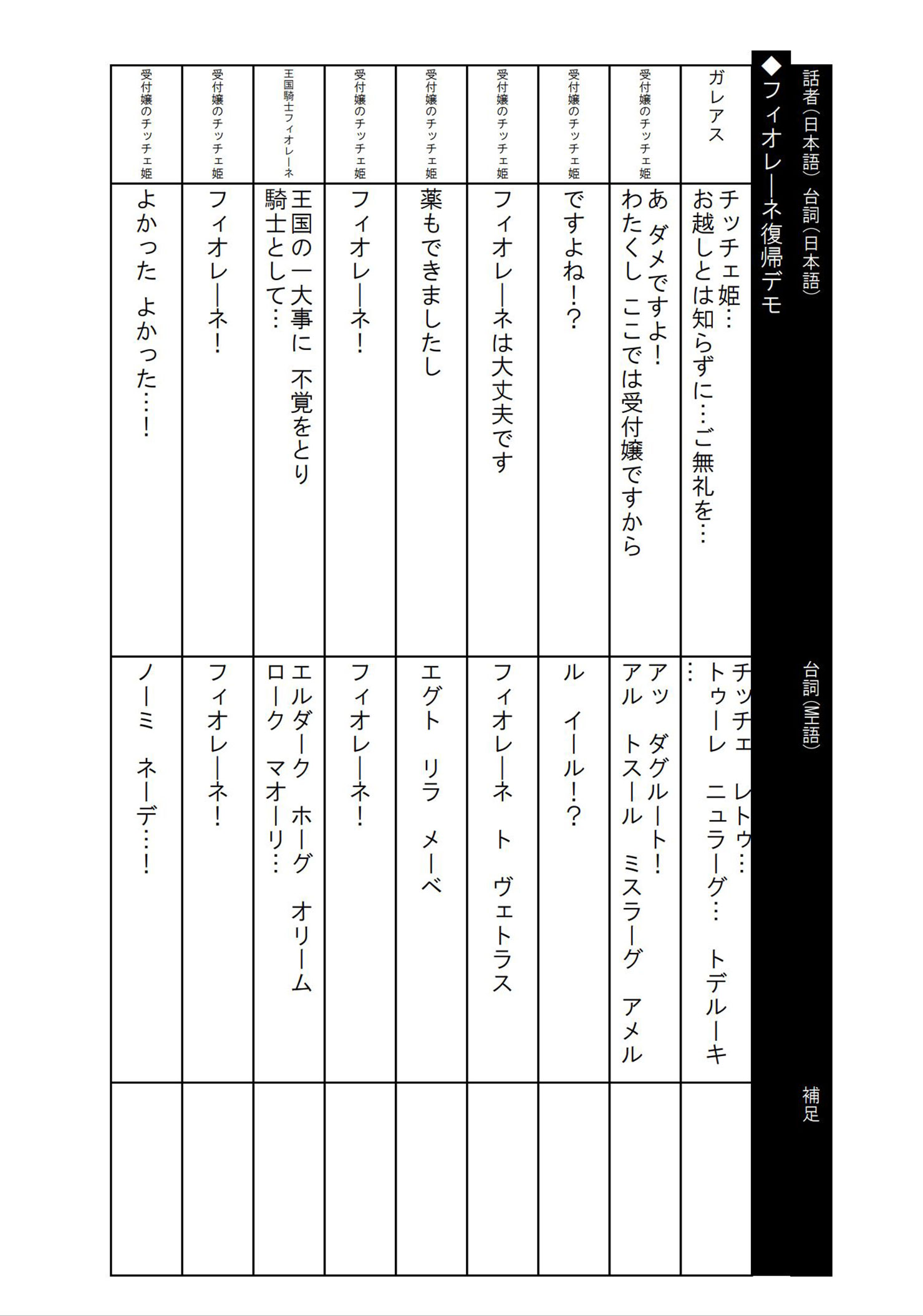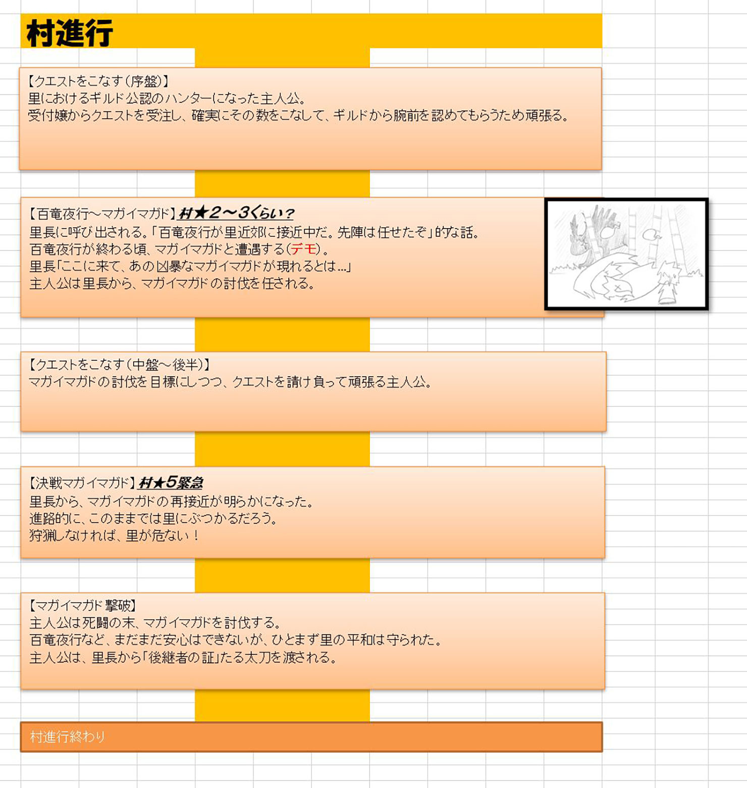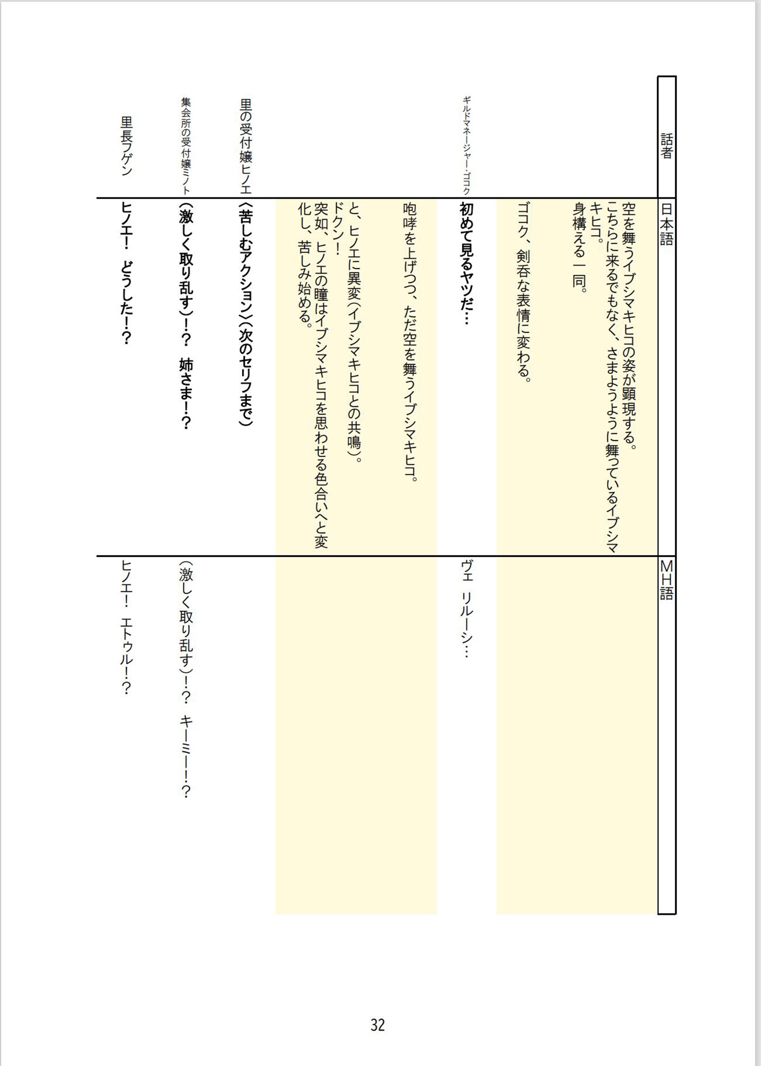 Next, the game designers decide which monsters are going to appear in the game and what kind of elements make up the core experience, like for instance Palamutes, the Rampage, Followers, the Qurio, etc. This is where I start building the framework of the story, i.e., the outline and the plot. From here on, I start hammering out the details, and deciding on settings for each character and such. Once the quest list starts to be built, and I know the order in which the monsters are going to appear, as well as which monsters are going to be used for Urgent Quests, I start making the progress chart for the story. This goes a step further than the plot, so I have to start coming up with the flow of story beats like “This thing happens here, and then this character appears to help the player out” or “This thing happens here, and the hunter has to escape from the flagship monster” in accordance with the quest list. Once the progress chart has been determined up to a point, I start writing the scenario. This is one of the most complicated steps in the process, but the game’s scenario is based on the contents of the game itself, so my personal opinion is that you should be flexible and adjust the scenario to the game as you see fit. Especially in the case of Monster Hunter, since it is a series about hunting after all, including elements to get the player excited to start hunting is one of the most important aspects of the story. Of course, sometimes I ask the team to change some elements of the game in order to accommodate the story, but this is a relatively rare occurrence.